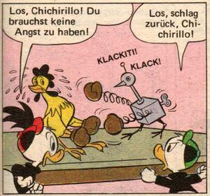Und noch ein Urlaubsparadies: In Bendormira findet unter Begleitung seiner Neffen Donald seine Ruhe, denn die Bewohner sind womöglich noch verschlafener als er selbst. Das ändert sich schlagartig, als die Kampfhahnsaison beginnt. Donald ist angefixt und beschließt, einen Hahn mit nach Entenhausen zu nehmen. Doch Betrüger drehen ihm – mit falschem Schnabel – den sanftmütigen Chichirillo an. Donald fordert mit seinem vermeintlich guten Kauf den großmäuligen Hühner-Heini heraus. Doch im Training macht dessen Kämpfer gute Fortschritte, während Chichirillo… na ja! Und auch im Kampf selbst wird letzterer mühelos niedergestreckt, aber zur Furie, als er sein „Herrchen“ Donald durch den aggressiven Heini in Gefahr geraten sieht. Am Ende sitzt Chichirillo mit den Ducks beim – vegetarischen – Abendessen zu Tisch…