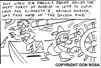 Einerseits heißt es in diesem Prolog, dass Sir Dagobert der Erste Offizier von Sir Francis Drake auf der „Golden Hind“ war. Als Sir Drake 1578 die amerikanische Küste erreichte und dort das gut befestigte Fort Drachenfels errichtete, übertrug er Sir Dagobert das Kommando über das Fort und ließ ihn dort zurück. Dies würde Sir Dagobert Duck sprichwörtlich zum ersten Herren von Fort Drachenfels machen, aus dem später Fort Entenhausen und schließlich dank Emil Erpel die Stadt Entenhausen wurde.
