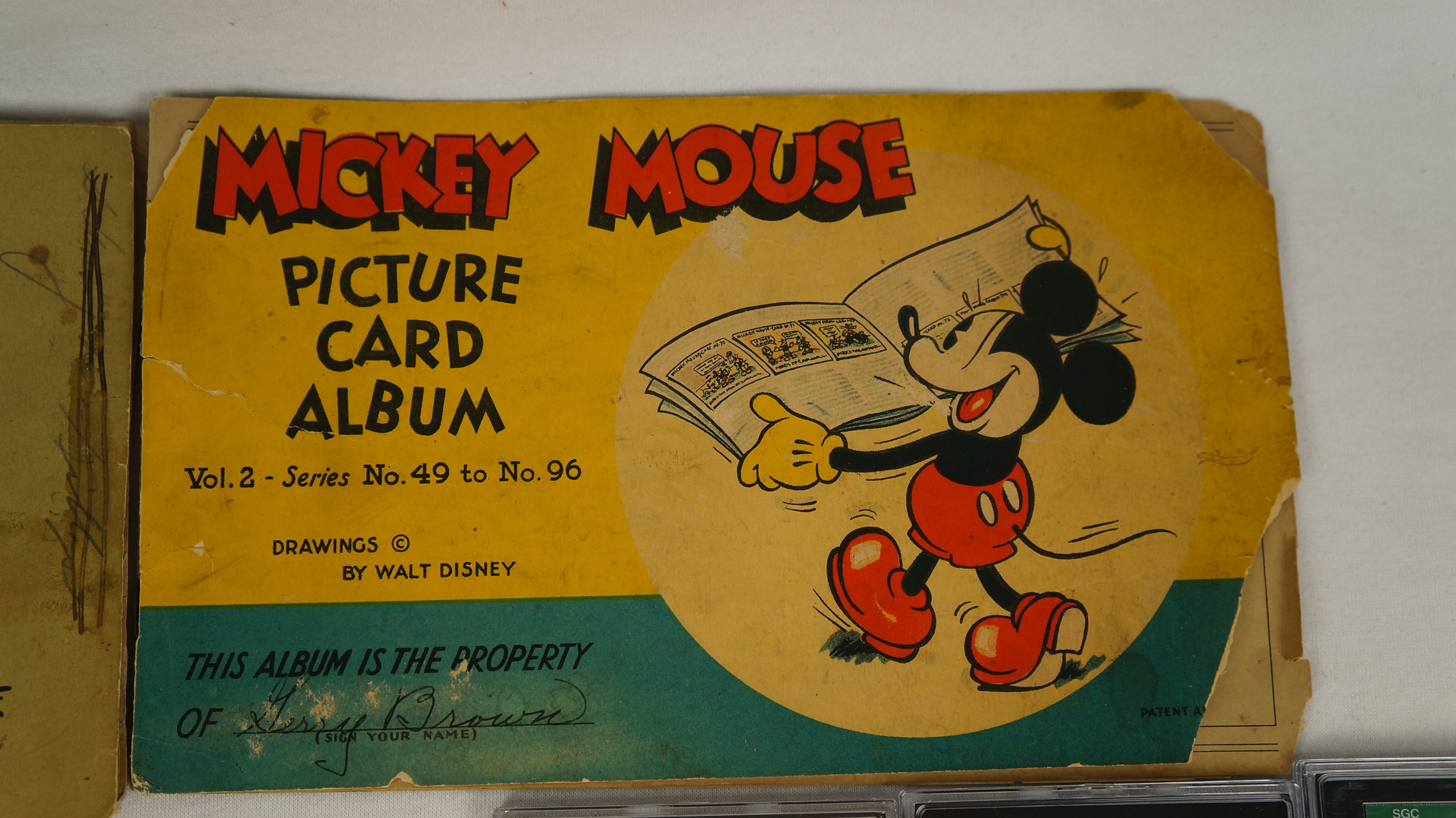 - „Nearly complete original Volume I & II sets of the classic 1935 Mickey Mouse Bubble Gum cards issued by Gum, Inc. There are 48 cards in each volume. This lot includes 81 out of a possible 96 cards (85% complete). A total of 14 cards have been professionally graded by PSA and SGC. Mickey Mouse Bubble Gum cards are considered by many to be the single most classic 1930s non-sport bubble-gum card set. The brilliant colors, high-quality artwork, and popular subject matter have always made this set a favorite with collectors. It is also worth noting that cards from this set are much scarcer than most collectors realize, and far more difficult to find than most baseball cards of the era (such as Goudeys, National Chicles, Play Balls, etc.). Volue I is only missing card #46. Volume II is missing the following: 60, 61, 64, 70, 77, 81, 85, 86, 88, 89, 92, 93, 94 and 96. Card #'s 13, 16, 31, 33, 34 and 36 remain affixed in the Volume I booklet. Cards range in condition from FR-PR to EX/MT condition. This is a very difficult collection to complete. These 2 volumes of Mickey Mouse cards are one of the most popular of all 1930s gum card sets, with tremendous crossover appeal to both card collectors and Mickey Mouse collectors.“